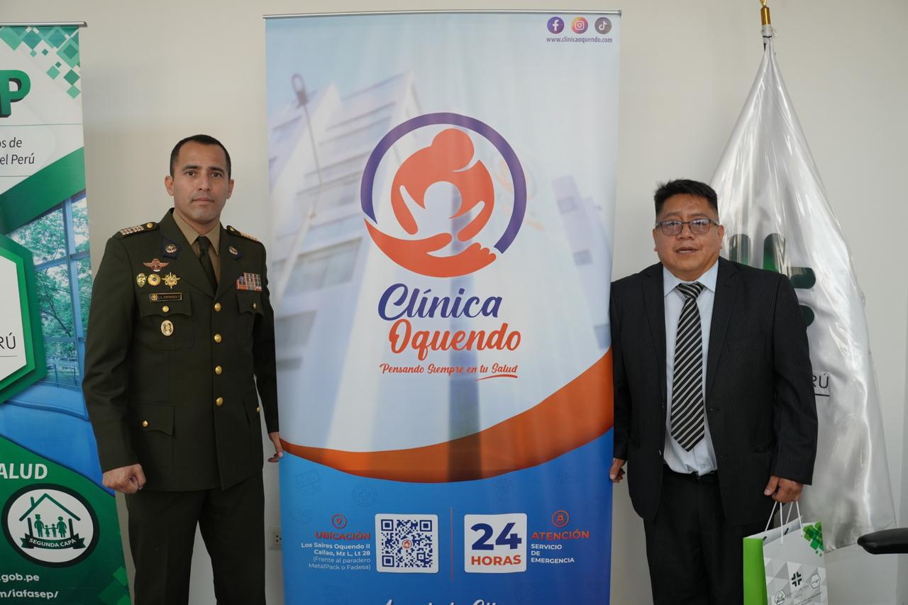 La Institución Administradora de Fondos de Aseguramiento en Salud del Ejército del Perú (IAFAS EP) y la prestigiosa clínica Oquendo, ubicada en Mz. L, Lt 28 Los Saires de Oquendo, Callao (Frente a MetalPack o Fadesa), han firmado un convenio de prestación de servicios de salud. Esta decisión se tomó debido a la excelente calidad de atención y servicios que brinda la referida clínica, la cual ha sido reconocida por nuestros afiliados y sus derechohabientes. La clínica Oquendo se destaca por su compromiso con la salud y el bienestar de sus pacientes, La Clínica Oquendo se distingue por su sólida trayectoria y compromiso permanente con la salud integral de sus pacientes, brindando atención médica con altos estándares de calidad, tecnología moderna y un equipo profesional altamente capacitado. Cuenta con servicios especializados, áreas de emergencia, hospitalización, sala de operaciones implementada, apoyo diagnóstico y atención personalizada, orientada siempre al bienestar y pronta recuperación de quienes confían en sus servicios. Gracias a este nuevo convenio, más personas podrán acceder a los servicios de esta reconocida clínica, garantizando así una atención médica de primera categoría para todos los beneficiarios de la IAFAS EP.