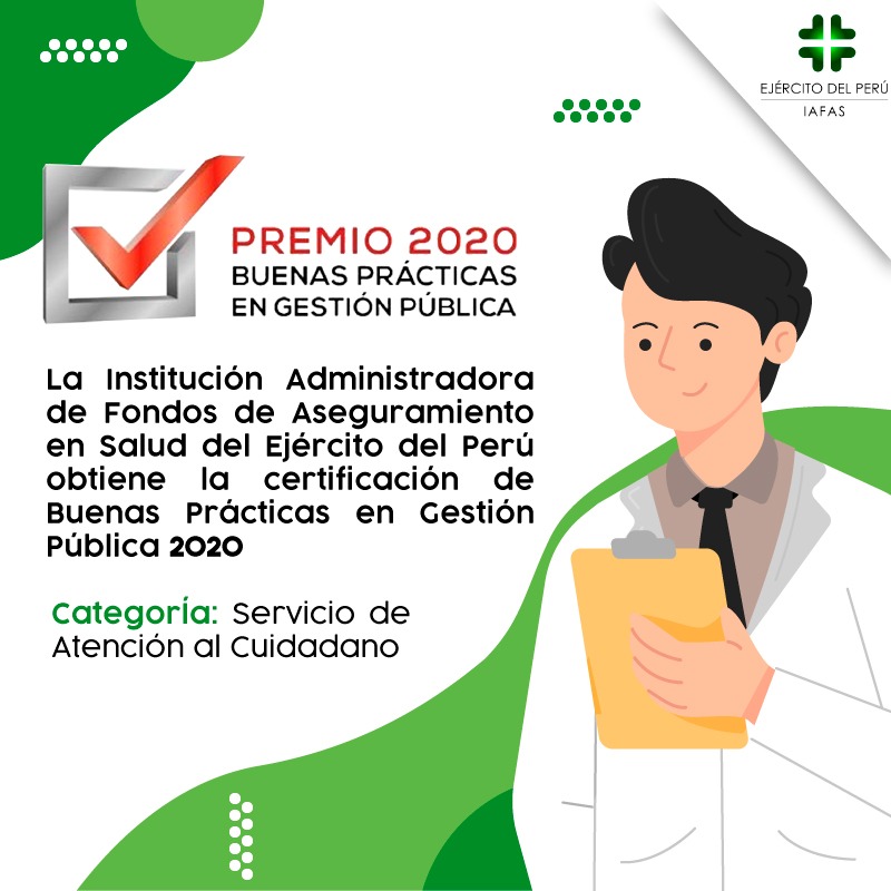 La Institución Administradora de Fondos de Aseguramiento en Salud del Ejército del Perú continúa su progreso y obtiene certificación en el concurso de “Buenas Prácticas en Gestión Pública 2020” en la categoría Servicio de Atención al Ciudadano, en el cual postuló su iniciativa denominada “Mejoramiento del proceso de apoyo de atención al paciente, miembro de la familia militar durante la emergencia sanitaria por COVID - 19”, debido a que, en época de pandemia, realizó la entrega de medicamentos a domicilio.